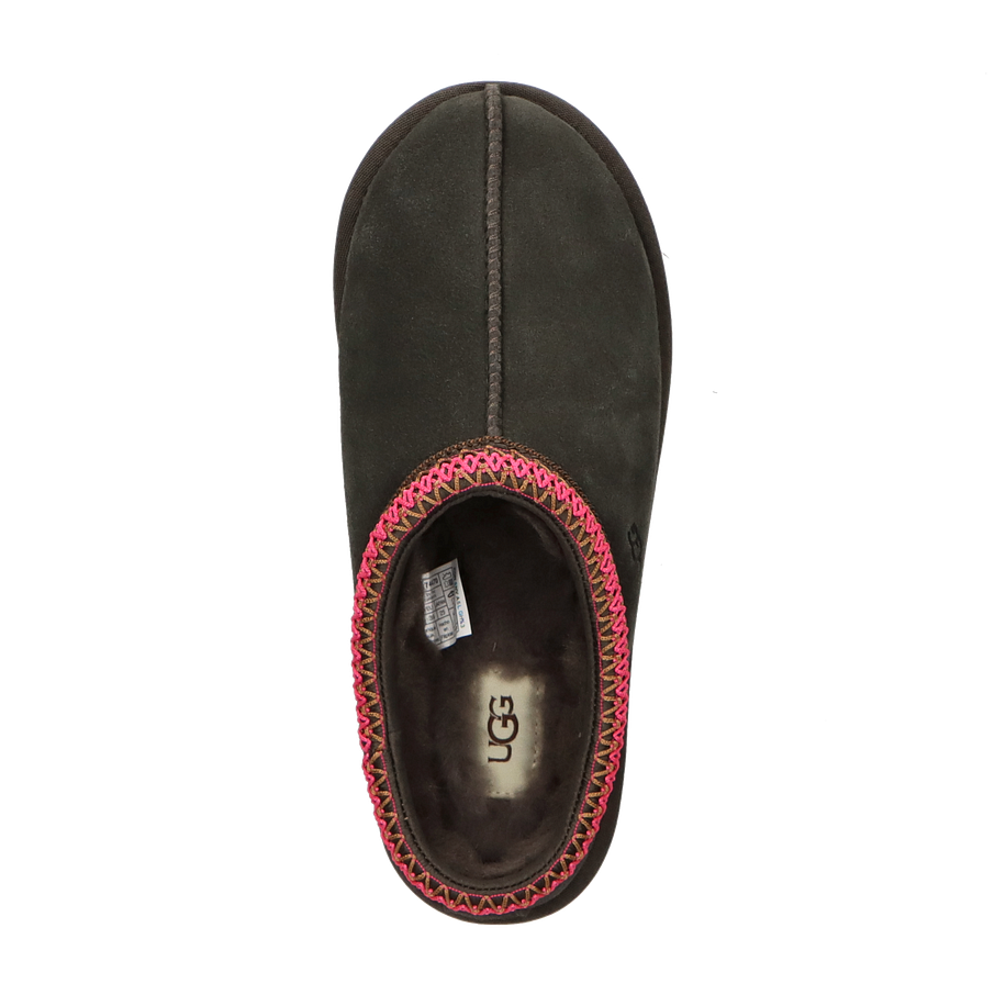 Die UGG TASMAN II Pantoletten für Damen präsentieren sich in einem stilvollen Braun mit auffälligen pinken Akzenten entlang des Kragens. Das Design verbindet Komfort mit einem modernen Look, ideal für entspannte Tage zu Hause oder kurze Ausflüge. Der weiche Lammfellbesatz sorgt für ein luxuriöses Tragegefühl, während das robuste Leder-Textil-Obermaterial eine langlebige Qualität gewährleistet. Die Pantoletten sind perfekt für alle, die Stil und Gemütlichkeit schätzen.