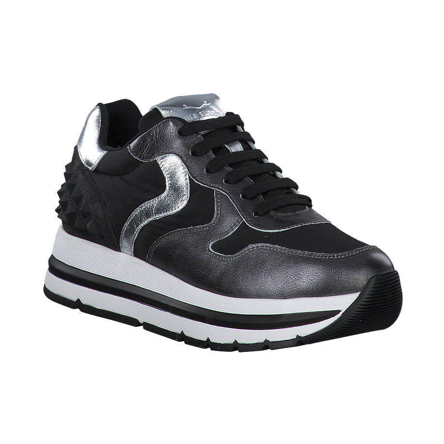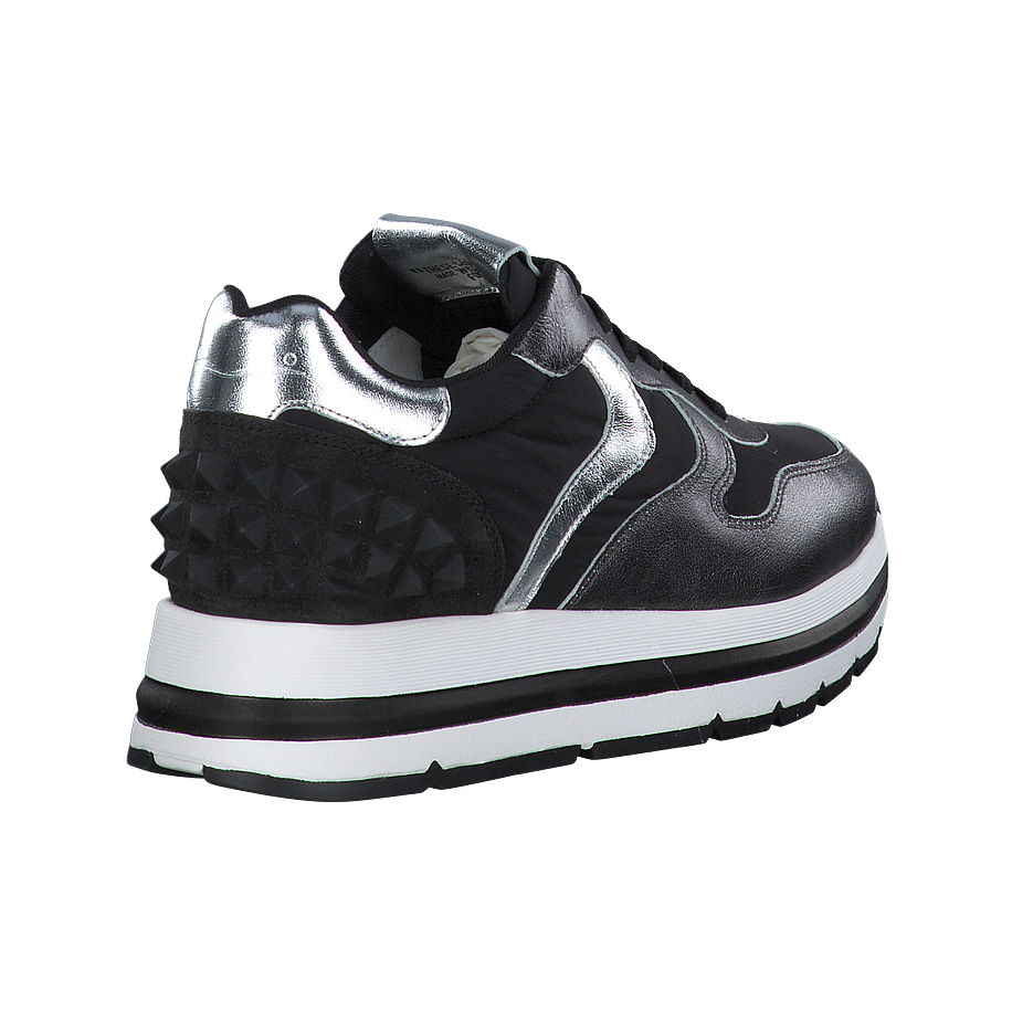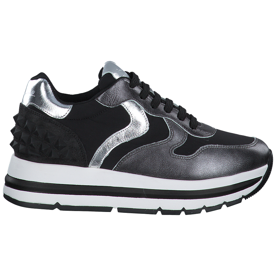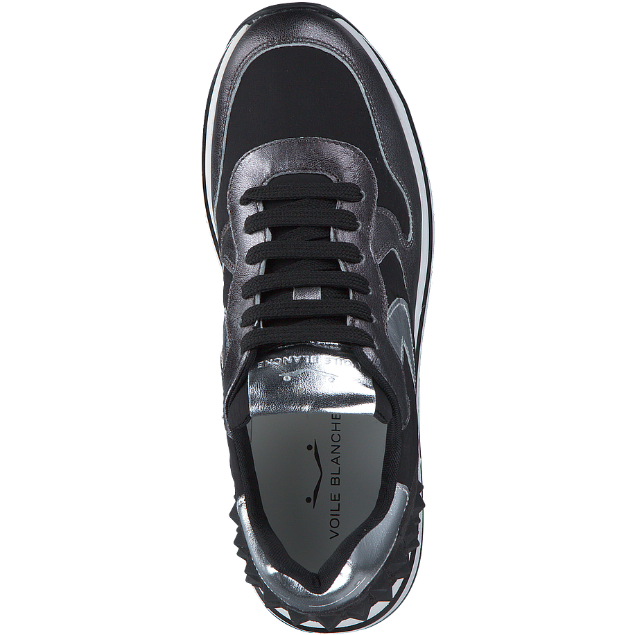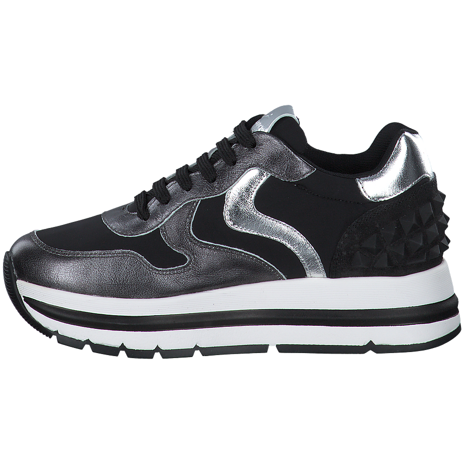 Auch mit schwarzen Sneakers lassen sich ungewöhnliche und überaus moderne Looks kreieren, wie diese schicken Voile Blanche Plateau-Sneaker eindrucksvoll unter Beweis stellen. Die schwarzen Damenschuhe sind aus hochwertigem Leder hergestellt, welches durch strahlend schöne silbrig schimmernde Patches verziert wird und so bestens in Szene gesetzt wird. Auch die breiten Plateausohlen mit schwarzen Querstreifen auf weißer Basis tragen zu dem aufregenden Look bei und sorgen zugleich für einen traumhaften Komfort. Die Rückseiten der Schuhe werden von schwarzen Nieten geziert, sodass die Schuhe ein rundum gelungenes Meisterwerk darstellen, was Sie unbedingt in Ihre Outfits einbringen sollten!